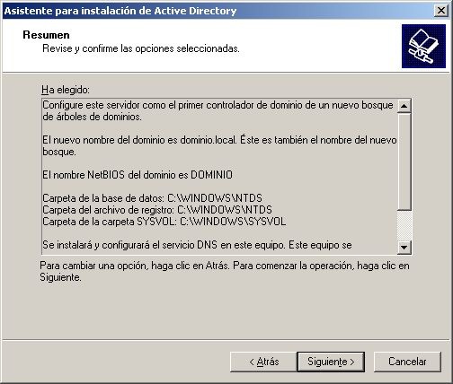 Aquí se definen las rutas donde se almacenan la base de datos del dominio y los fichero log. En dominios grandes es recomendable situarlos en diferentes controladores y discos duros para mejorar el rendimiento. Dejamos las rutas predeterminadas y pulsamos el botón Siguiente. Aparecerá la siguiente ventana: