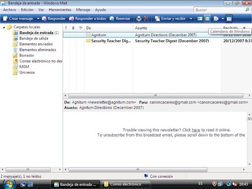 Puedo encontrar: Bandeja de entrada, Bandeja de salida, Elementos enviados, Elementos eliminados, Borrador, Correo electrónico no deseado, MGM y Universia. Las 7 primeras carpetas que acabo de nombrar, son carpetas creadas de forma automática por Windows Mail, las otras 2, MGM y Universia, son carpetas que he creado para organizar mis correos.
