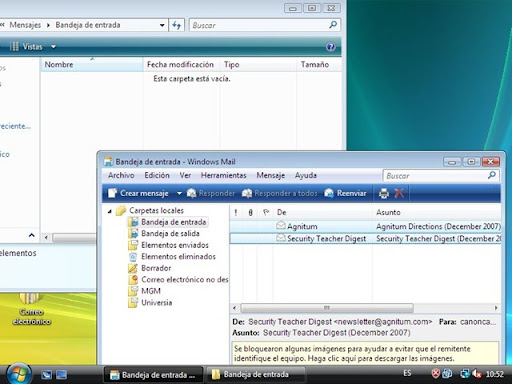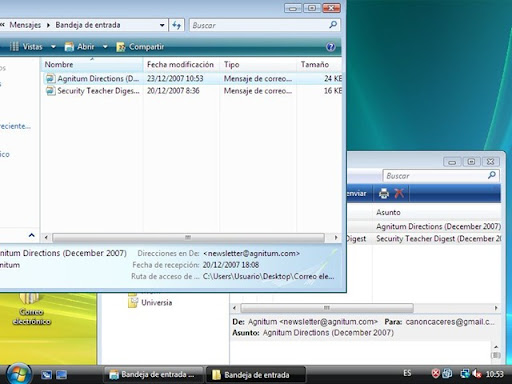 Accedemos a la subcarpeta Bandeja de entrada y la misma en Windows Mail. Debemos colocar ambas ventanas, Windows Mail y Mensajes, de forma que se puedan arrastrar todos los mensajes de una a otra. Veamos como lo he colocado yo...
