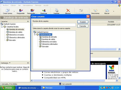 Recordamos que las carpetas que hemos guardado de Windows Mail son: Bandeja de entrada, Elementos enviados, Borrador, MGM y Universia. Las 3 primeras están creadas en Outlook Express, sólo nos falta crear MGM y Universia.