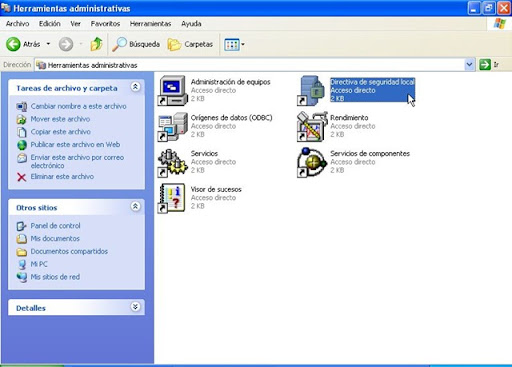 Iniciamos sesión con una cuenta del grupo Administradores. Comenzamos por abrir Inicio->Panel de control->Rendimiento y mantenimiento->Herramientas administrativas->Seguridad de directiva local.