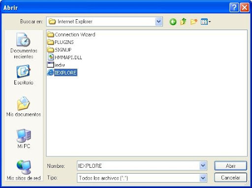 En mi caso, busco el fichero iexplore.exe que se encuentra en el directorio c:\Archivos de programa\Internet Explorer.