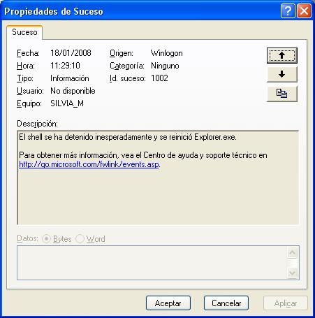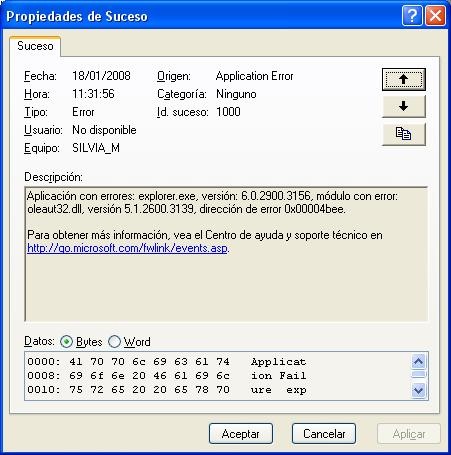 Cuando se produce este error, suele grabarse un suceso Id 1000 y/o 1002 en el Visor de sucesos de Windows similar a las siguientes capturas de pantalla: