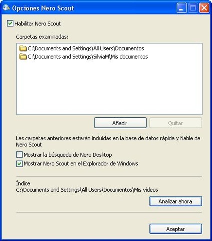 3. Desmarcamos la casilla Habilitar Nero Scout y se quedará todo en gris.