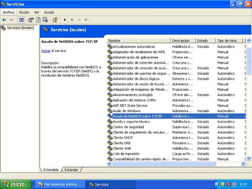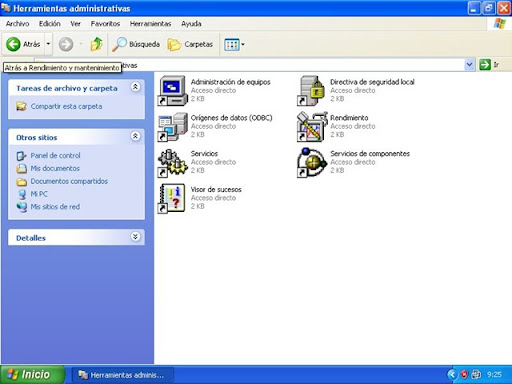 1. Vamos a Inicio->Panel de control->Rendimiento y mantenimiento->Herramientas administrativas y nos aparecerá una ventana similar a la siguiente: