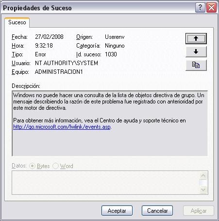 En cuanto a la descripción del suceso 1030 sería similar a esta: Windows no puede hacer una consulta de la lista de objetos directiva de grupos. Un mensaje describiendo la razón de este problema fue registrado con anterioridad por este motor de directiva.